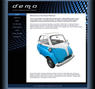 Using pre-built standardised layouts allows us to develop your website quickly and keep our prices very low. You can choose one of the following layouts for your website or you can let us determine which layout is most suitable for your website. If you prefer a custom layout and design, please contact us for a quote.